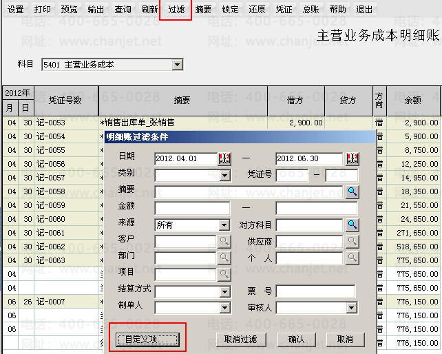 4.账表查询时选择科目确定后,点击“过滤”按钮,点击自定义项,根据自定义项进行查询。