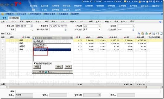 打开采购订单,点击“打印”—“打印模版设置”。弹出单据打印模版之后,选择系统模版,选择“存货编码”的单元格右键,选择“按该列排序升序”。