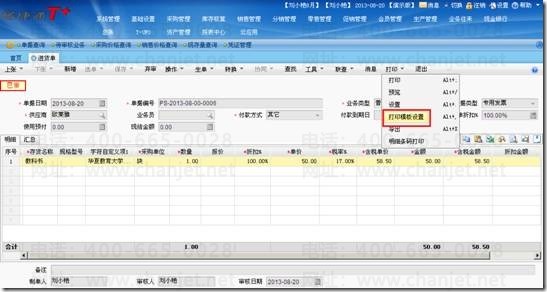 1、点击单据上的“打印”—“打印模板设置”。
