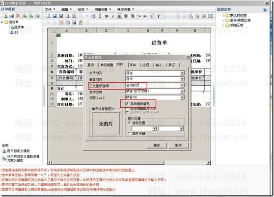 打开单据,点击“打印”—“打印模版设置”,单击选择需要设置的单元格,点击右键,选择“设置单元格格式”,打开“对齐”的页签,将“自动缩放填充”打上勾即可。设置之后字段内容会根据单元格大小自动缩放填充显示全部内容。