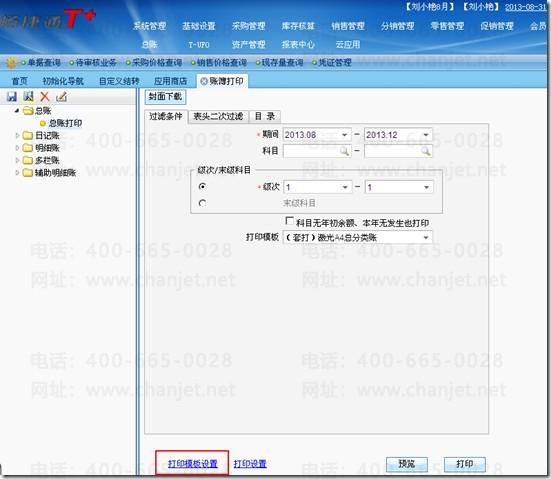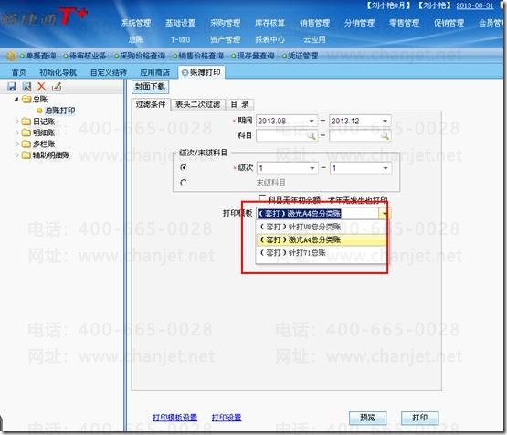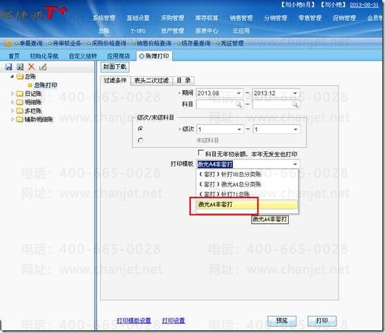 3、打印预览,非套打的模版设置完成后,在账簿打印的界面就能选择到对应的非套打模版进行打印预览。