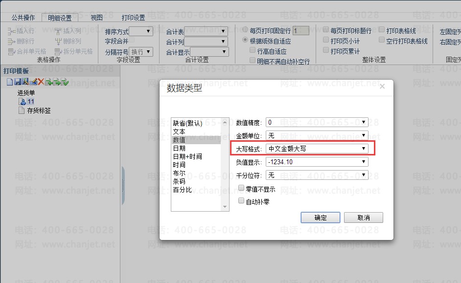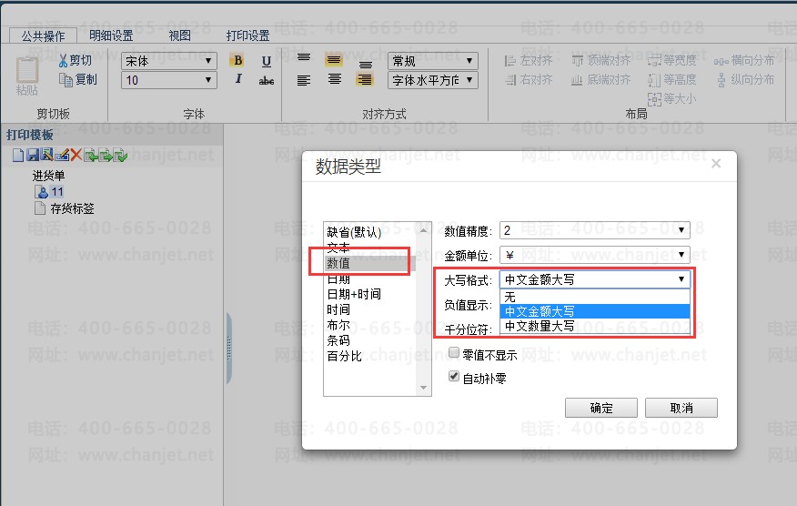取数公式设置完成后,选择单元格—右键—数据类型数值中选为中文金额大写,设置完成保存模板。
