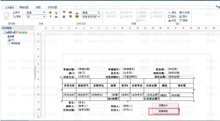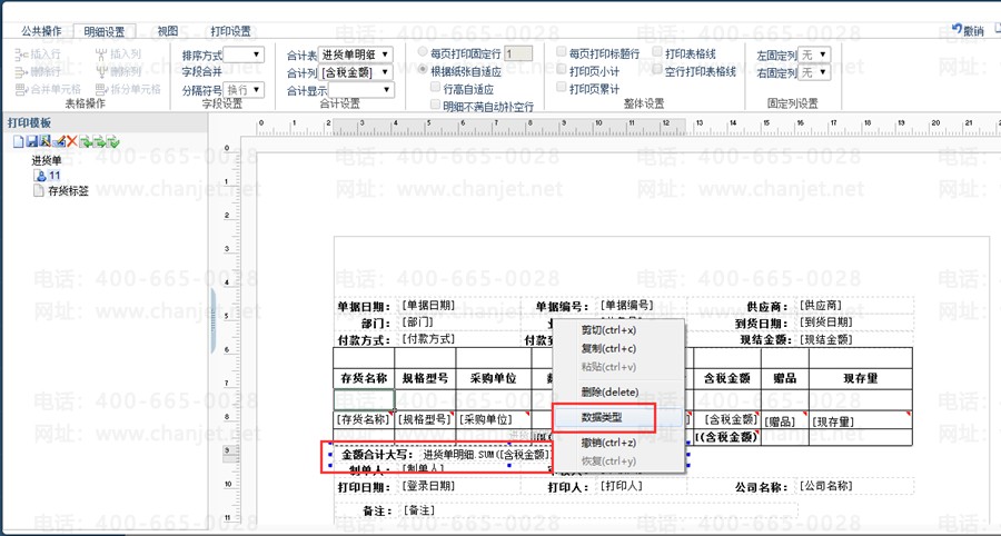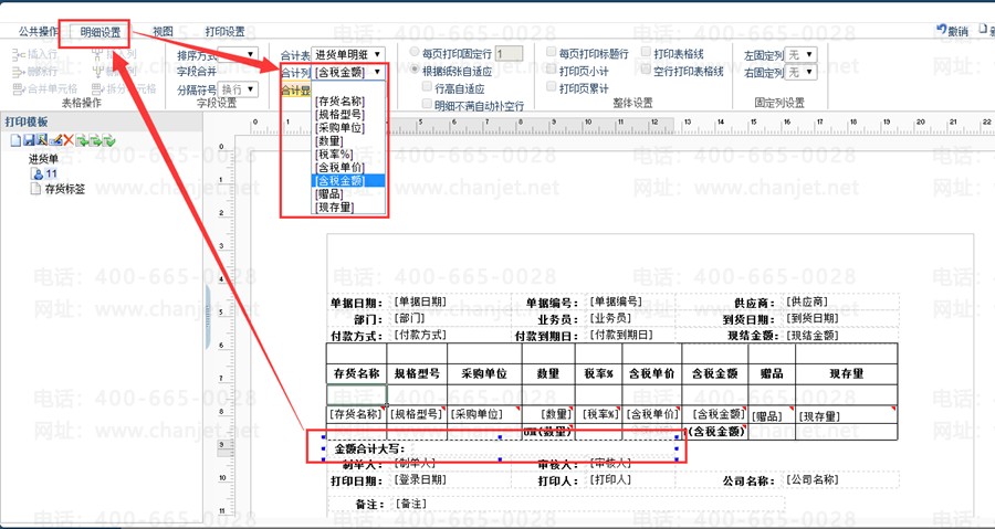 新增文本框之后,修改显示名称为“金额合计大写”,选择该文本框之后,点击明细设置,合并列中选择对应要取数的字段(下图设置效果即是,文本框的值等于表体的含税金额)。