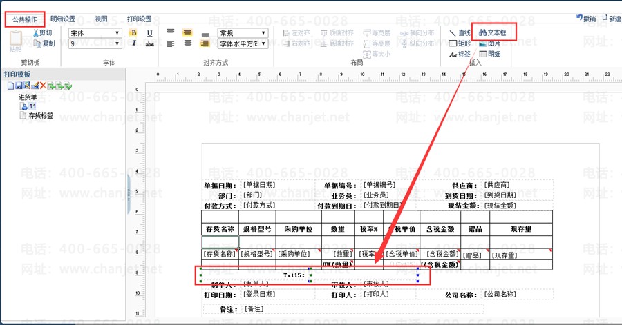 在公共操作中点击文本框,在表尾中新增一个文本框显示到对应的位置(下图是把原备注拉动到最下面,然后将新增的文本框放到备注的位置上)。