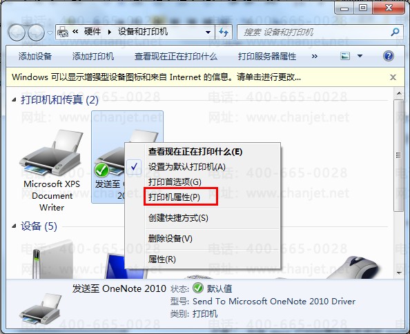 1、在“打印机和传真”窗口中,右击当前正在使用的打印机的图标,选择 “打印机属性”菜单项。