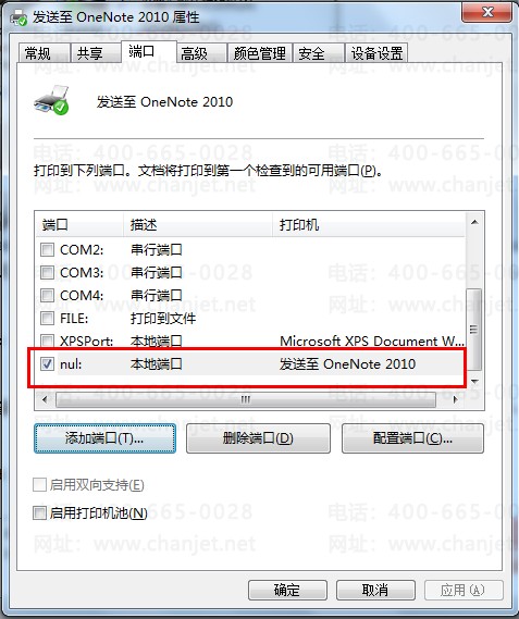 2.在“打印机属性”窗口中,点击“端口”页签,勾选nul 端口,然后点击“确定”按钮。
