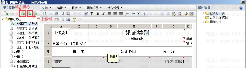 1、在打印模板设置中,左边列表框,向左箭头图标表示“导入模板”,向右箭头图标是“导出模板”(导出模板的快捷键是“ctrl+[“,导入模板的快捷键是“ctrl+]“,在以前模板中没有下图中的图标,可以直接使用快捷键实现模板的导出和导入)