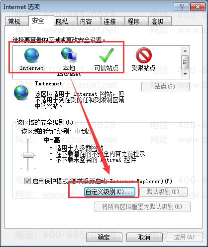 此问题需要将IE-工具下的“Internet选项”,安全页签中分别选中“Internet”、”本地Intranet”、“可信站点”,打开它们的“自定义级别”(注意:此处是分别都要去打开,等于是有三个自定义级别,比如先打开“Internet”的自定义级别设置好后,再选中”本地Intranet”,打开对应的自定义级别)