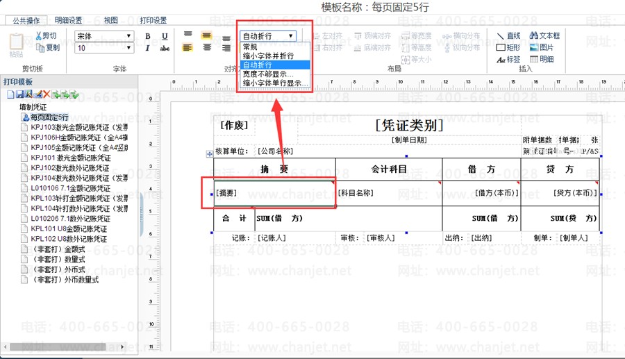 1、 在填制凭证中点击打印—打印模板设置,或者点击总账—打印凭证界面点击打印模板设置,打开模板之后,选择要设置的单元格,点击公共操作,在下图位置中可以设置为自动折行。