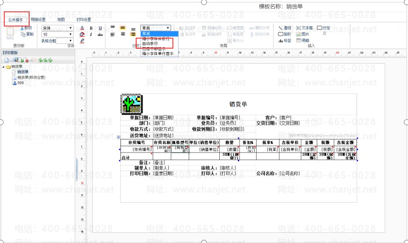 打印模版中【公共操作】针对明细设置【自动折行】
