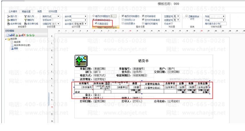 预览单据查看打印设置的效果。
