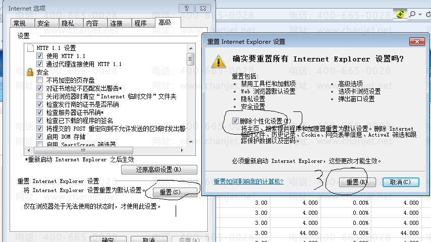 1) 重置浏览器,位置:internet选项->高级,然后按照下图1、2、3设置即可