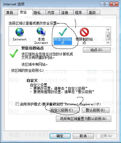 3) 首先打开软件,然后点击浏览器internet选项->安全,默认应该像下图中的“受信任的站点”是选中状态的(既是默认选中的状态),如果不是就要加入受信任的站点。