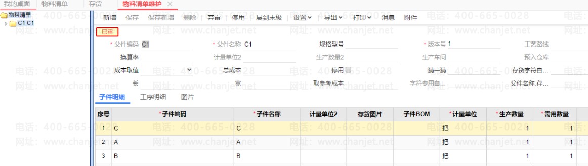 1、新建物料清单C1=C+A+B,;