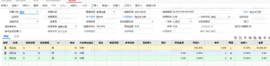 2、销货单,单据-工具-配比出库-选择C1,单据明细就是C和A和B,C输入单价金额,A和B勾选赠送;