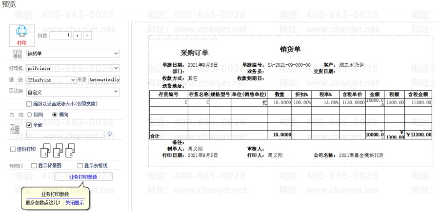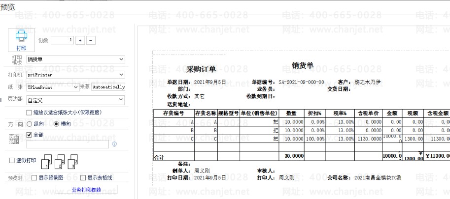 t+软件中销售C商品,打印显示C商品,实际出库B+C商品