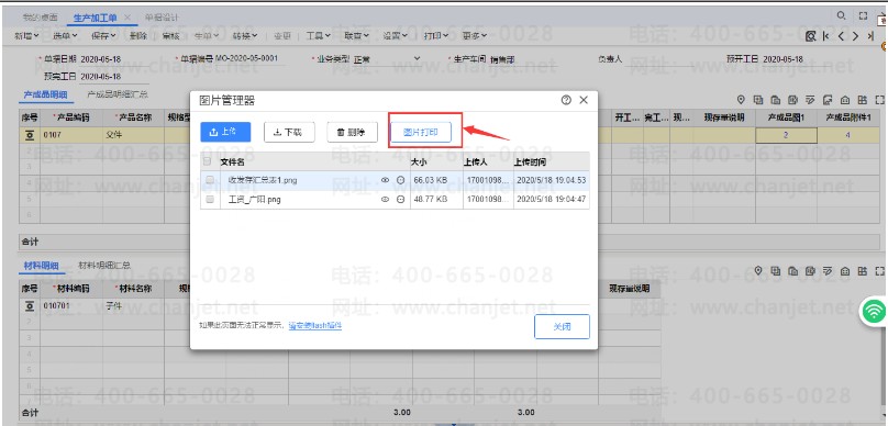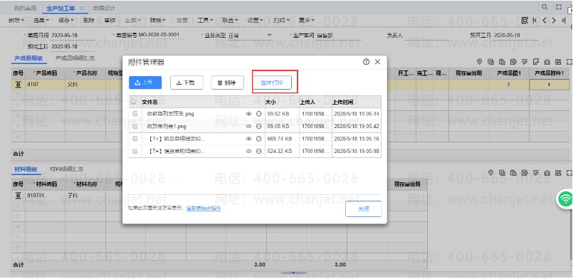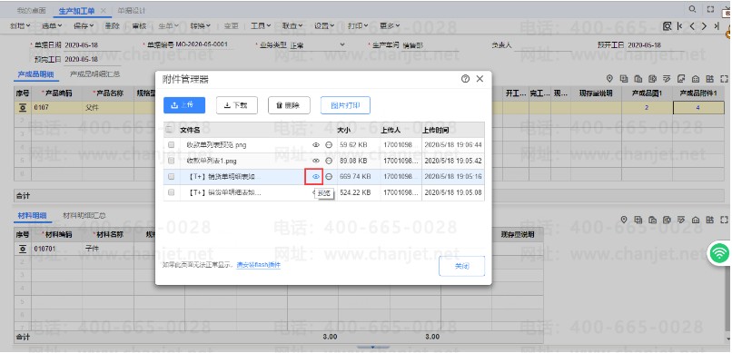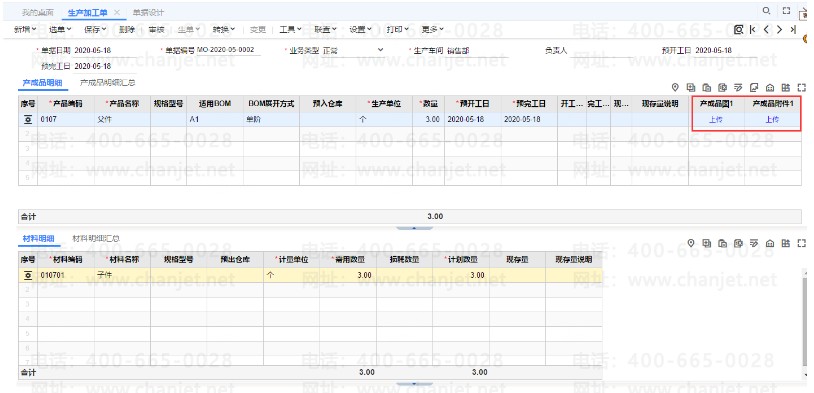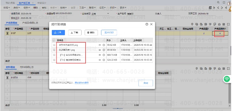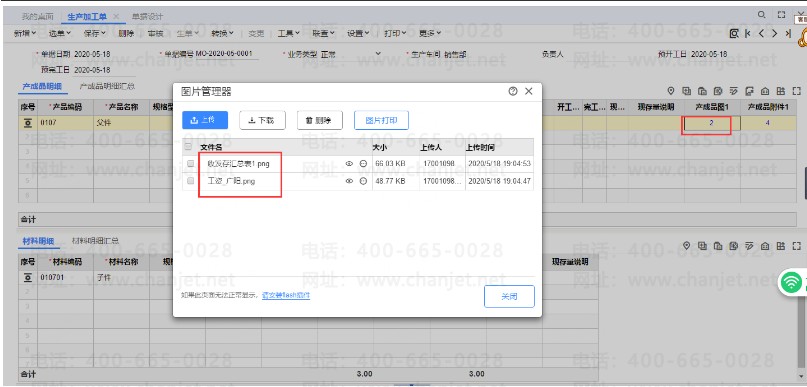 (2)生产加工单-产成品明细可以上传对应的图片,对应的附件