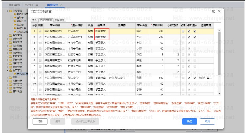 (1)单据设计-生产加工单-产成品明细启用字符自定义项,只来源图片类型,附件类型