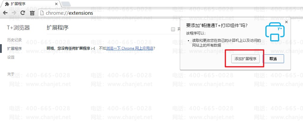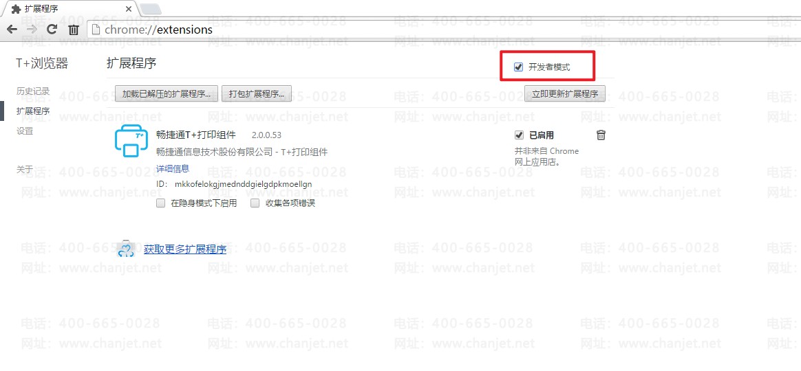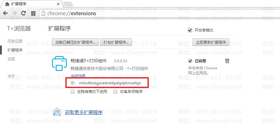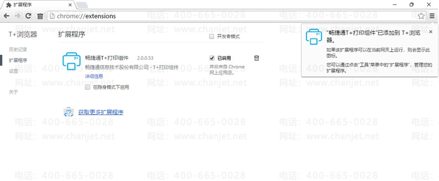 【问题现象】安装T+浏览器后发现没有打印扩展程序,或是遇到打印插件插件加载异常问题。