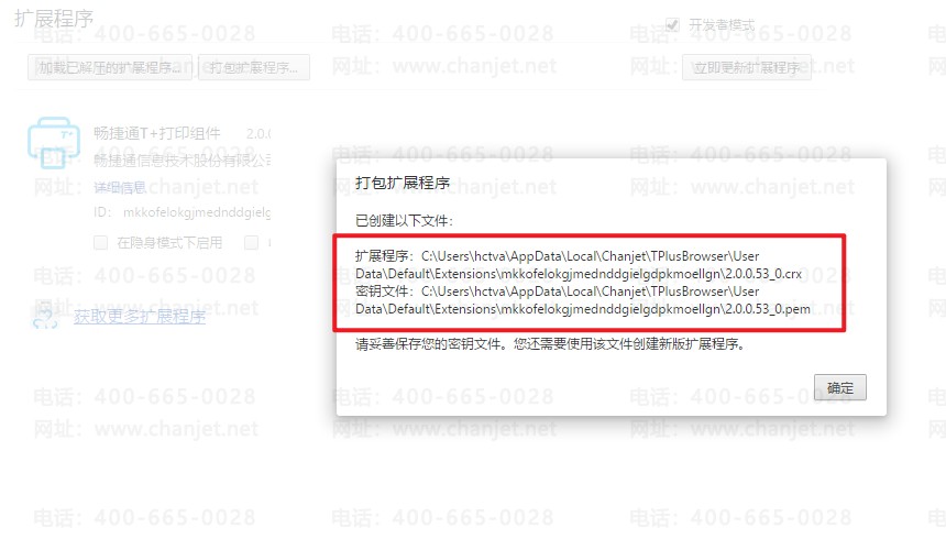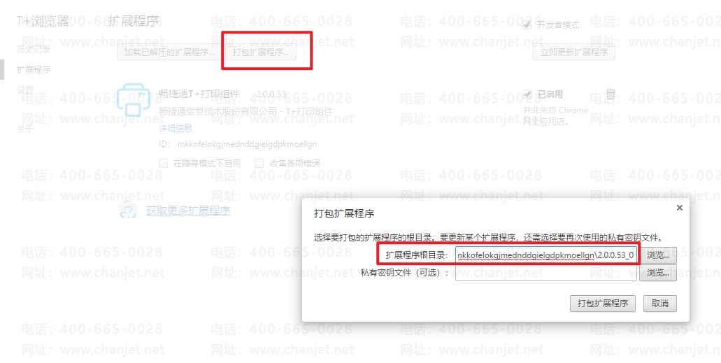 5、在正常T+浏览器中点击打包扩展程序,将复制的地址文本粘贴