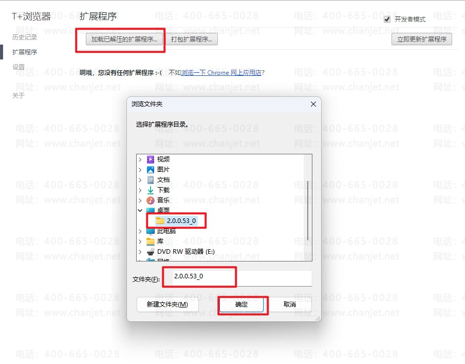 2、在T+浏览器中选择加载已解压的扩展程序,选择文件夹确定就行