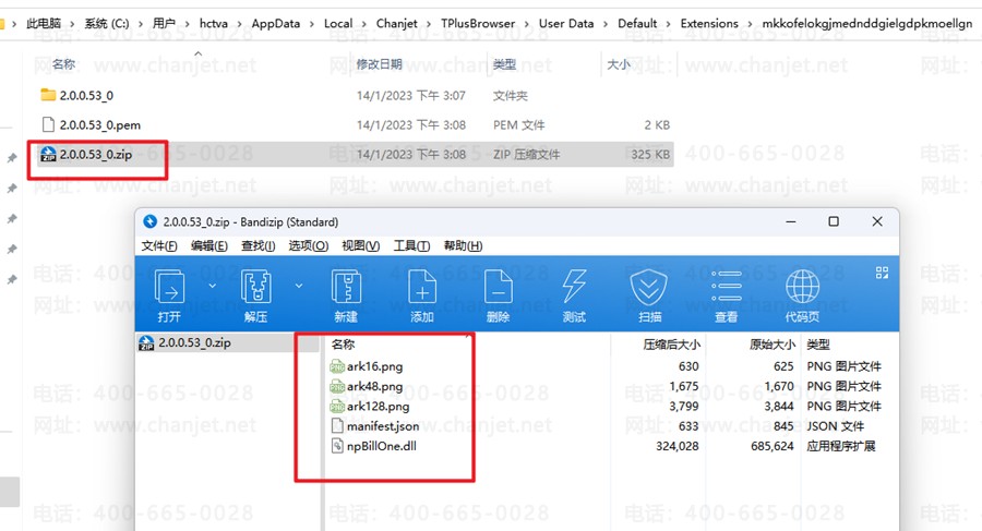 方法二:上述提到的billone.crx和2.0.0.53_0.crx扩展程序文件,可以将后缀名crx改成zip,解压后同样也能获得方案一中的文件夹,再按方案一中加载已解压的扩展程序