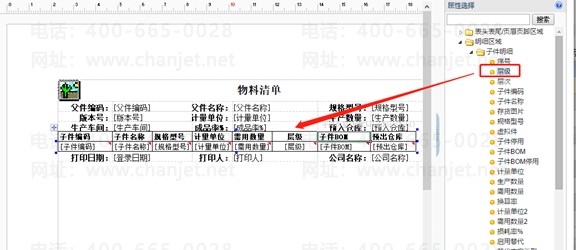 2.【明细设置】选择【插入列】,打印模板设置界面内点击右侧蓝色长条【属性选择】,在【子件明细】加入【层级】字段;