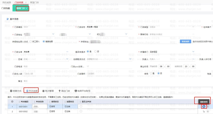 在新零售-智慧门店-门店档案中找相关门店,编辑门店中POS注册中注销POS机号;