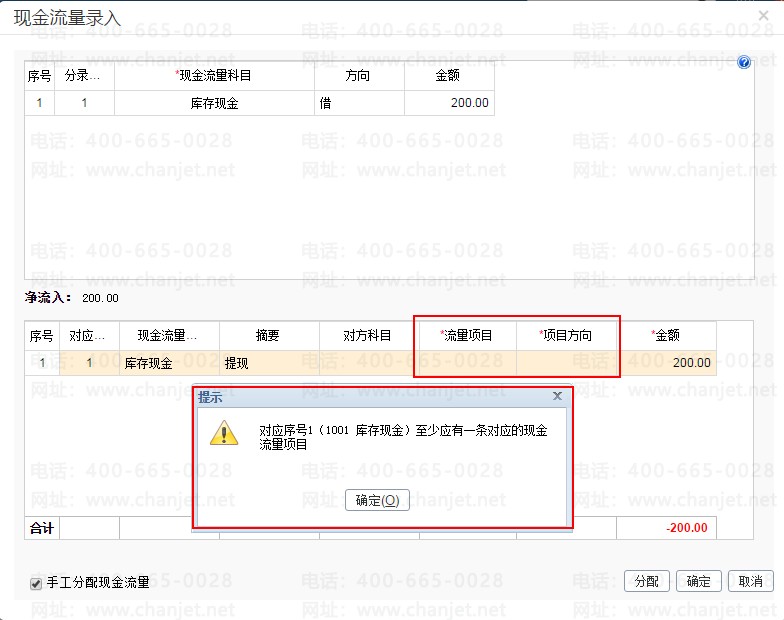 已经分配了现金流量的凭证不想分配现金流量了,不能直接在“流量”里面删行,会提示“对应序号 1 至少应有一条对应的现金流量项目”