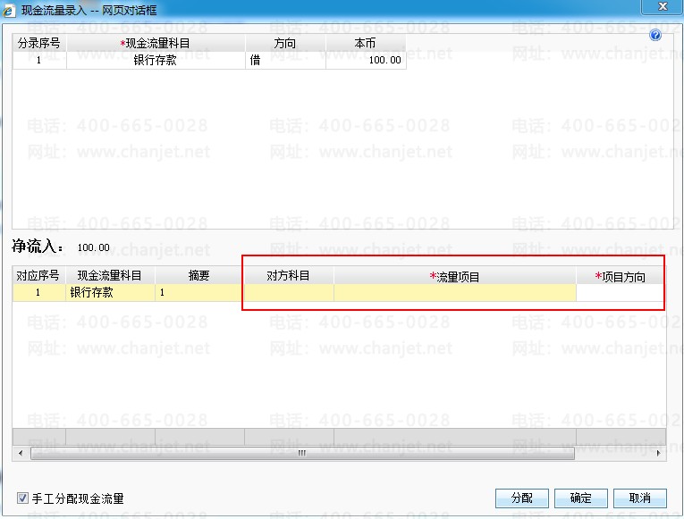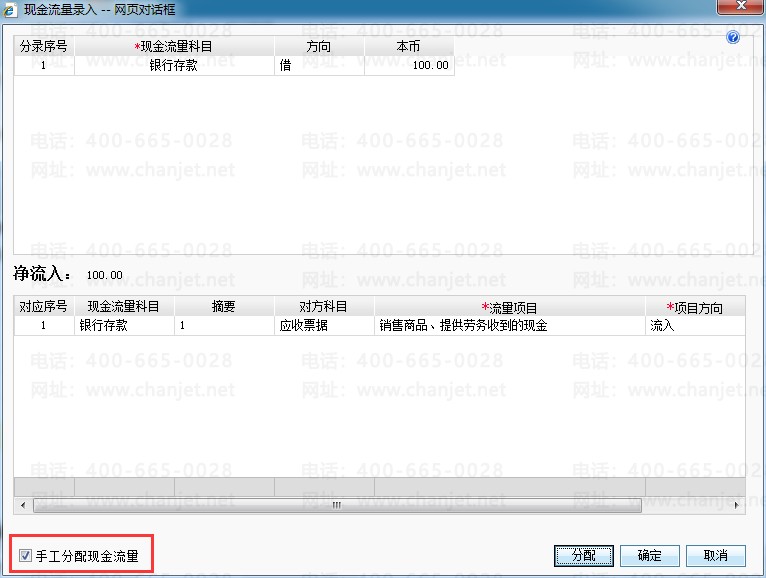3、在凭证中点击“流量”按钮,勾选左下角“手工分配现金流量”: