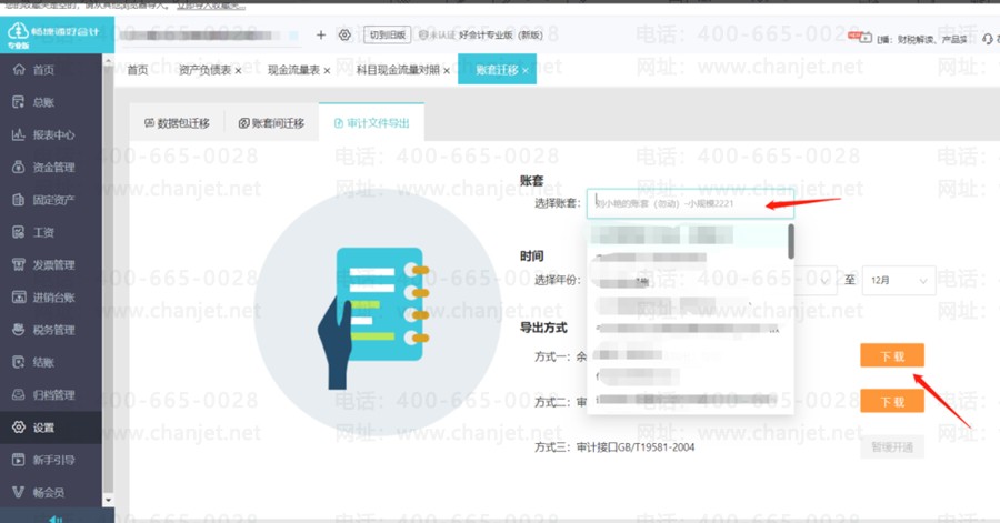 3、导出方式,选择方式一:余额表、序时账批量导出,选择账套和月份,点下载,下载出来是一个压缩包,解压出来是Excel的形式