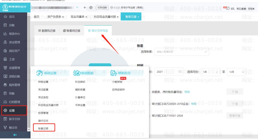 1、点【设置】-【账套迁移】-【审计文件导出】