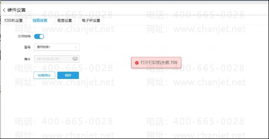 POS设置钱箱点击钱箱测试,提示‘打开打印机失败.709’报错