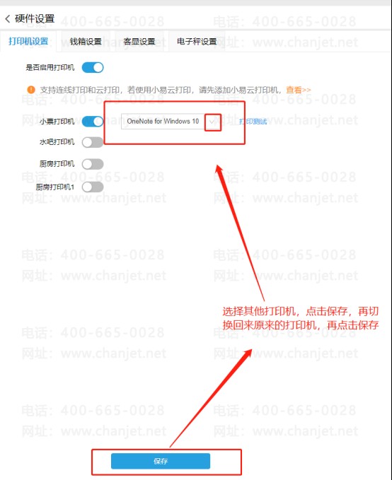 打印机设置选择重新选择一下其他打印机,点击保存,再选择回正确的打印机,点击保存,最后再去点击钱箱测试保存就可以了