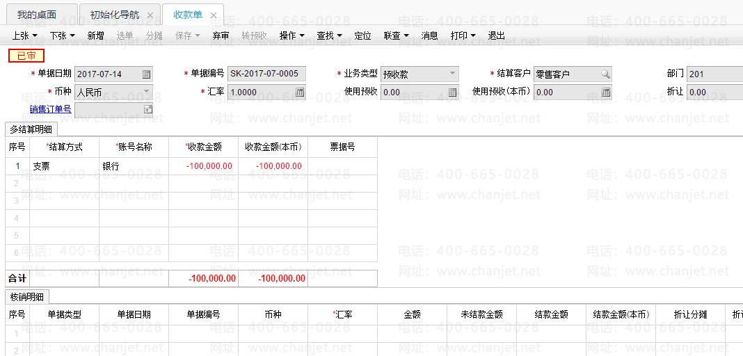 业务分析:首先做一笔10万元的预收款,退回时,使用预收冲预收的功能来冲销预收款。