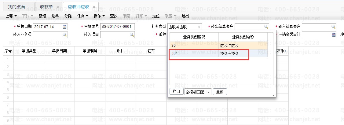 然后点击往来现金模块,进入应收冲应收,表头上的业务类型选择预收冲预收。