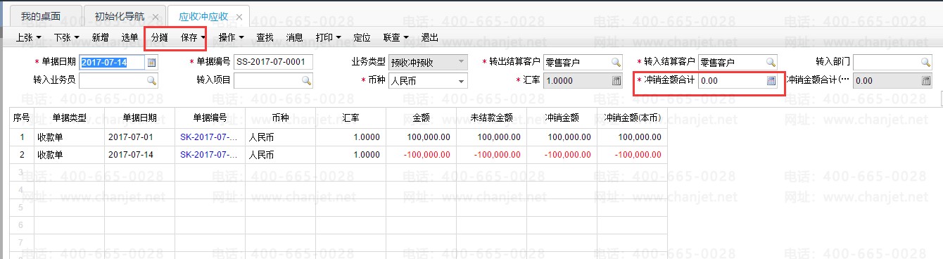 表头上的冲销金额合计录入为0,然后点击分摊、保存。