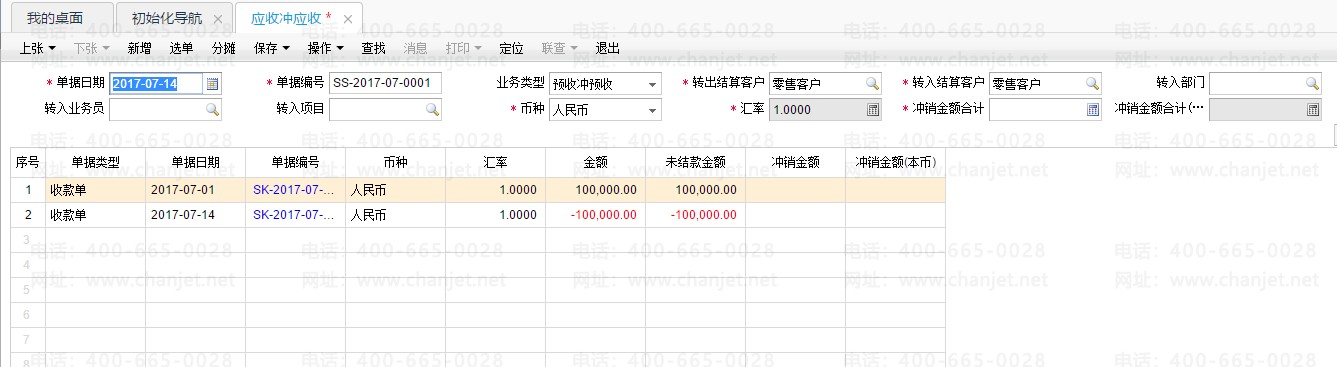 普及版中并没有往来冲销的功能,无法实现这种预收冲预收的业务,针对这种业务,只能做一正一负的预收款单,确保最终往来账款的余额正确,但是两张单据不能冲销。