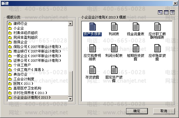 4、再次点开“财务报表”-“文件”-“新建”,在“模板分类”中选择“小企业会计准则(2013)”的资产负债表。点“确定”后即为修改后的模板。