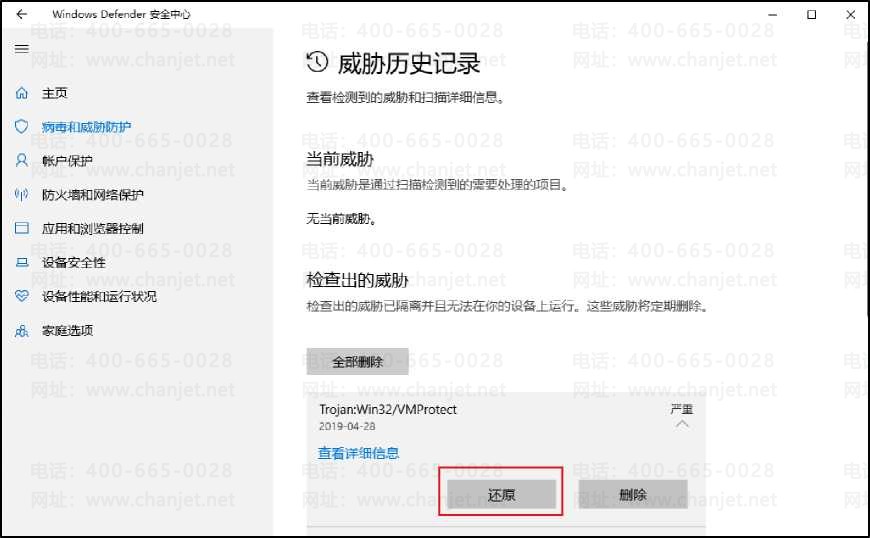 3.在【检查出的威胁】中,选择误杀的记录,点击【还原】。