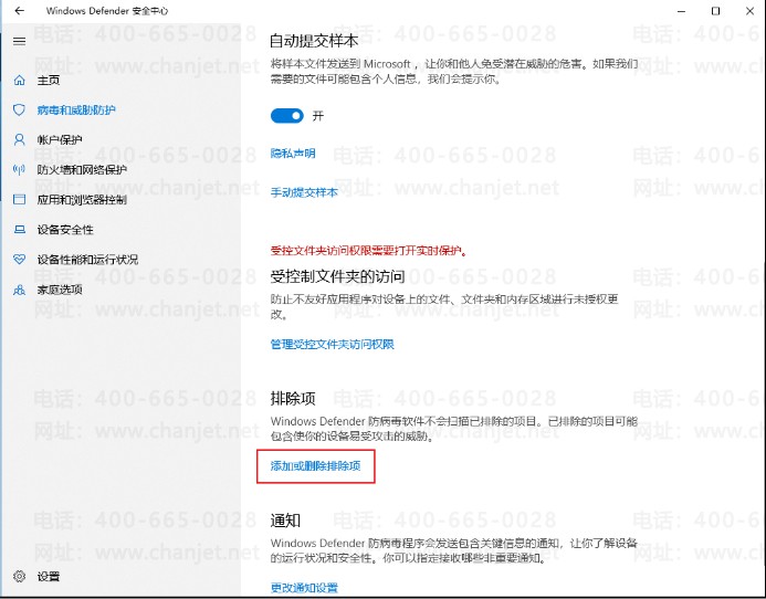5.在【"病毒和威胁防护”设置】中,点击【添加或删除排除项】。