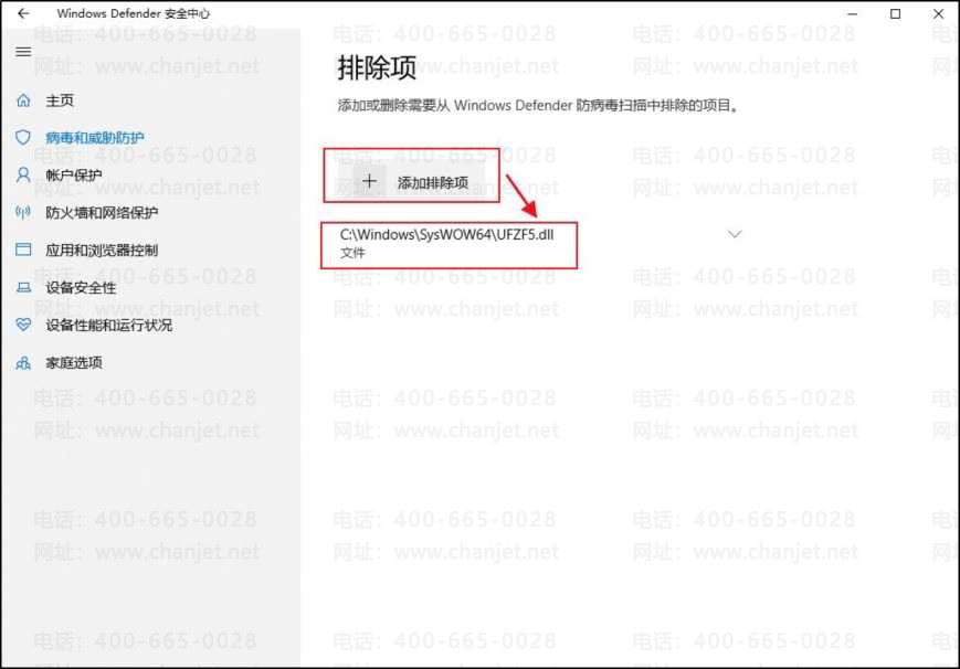 6.点击【添加排除项】,选择【文件】,将UFZF5.dlI文件添加。
