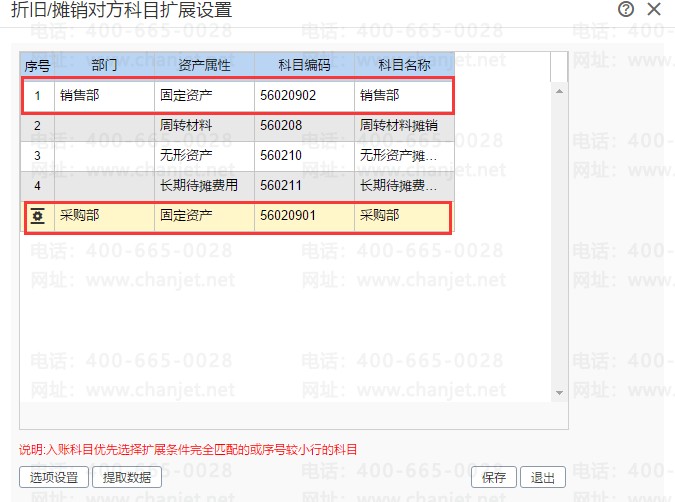 3、因为折旧费用按部门按比例计提,在科目设置-折旧/摊销对方科目-扩展设置中按照部门设置好科目: