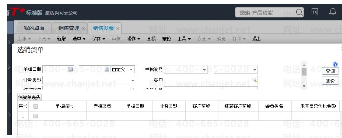 5、查询勾选需要生成销售发票的销货单,点击确定