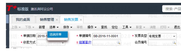 3、销货单立账时,填写完毕销货单,保存审核后自动生成销售发票