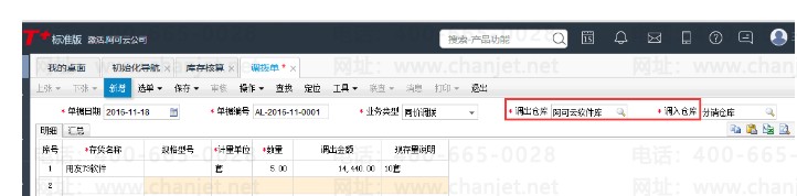3、填写调出仓库、调入仓库、商品数量等明细后保存
