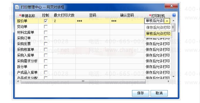 打印时机:保存后允许打印;审核后允许打印