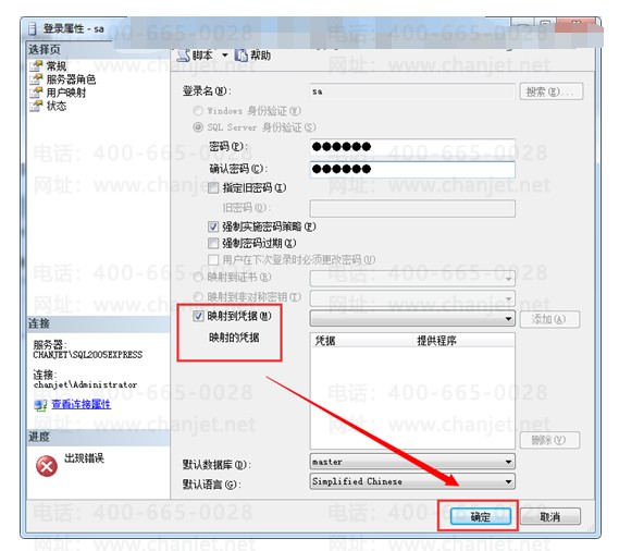 将SA密码设定好后,点选左边的“常规”,再勾选下面复选框“映射到凭据”,点击确定,就可以啦。