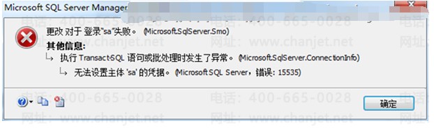 更改对于登录SA失败。执行Transact-SQL 语句或批处理时发生了异常。无法设置主体SA的凭证(Microsoft SQL Server,错误15535)