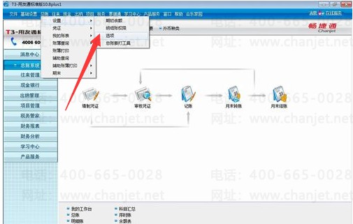 打开用友T3软件,点击顶部菜单总账--》设置--》选项功能